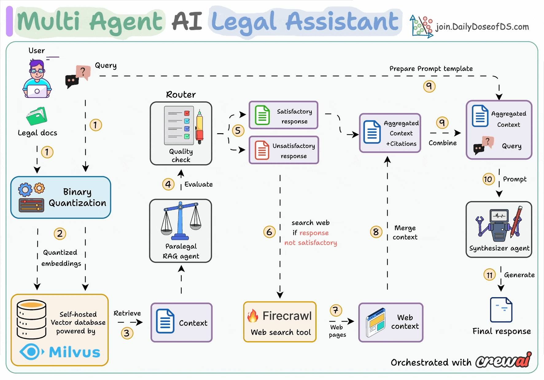 It leverages Agentic RAG to retrieve and contextualize information from both internal vector databases and the web, coordinated by multiple AI agents.
